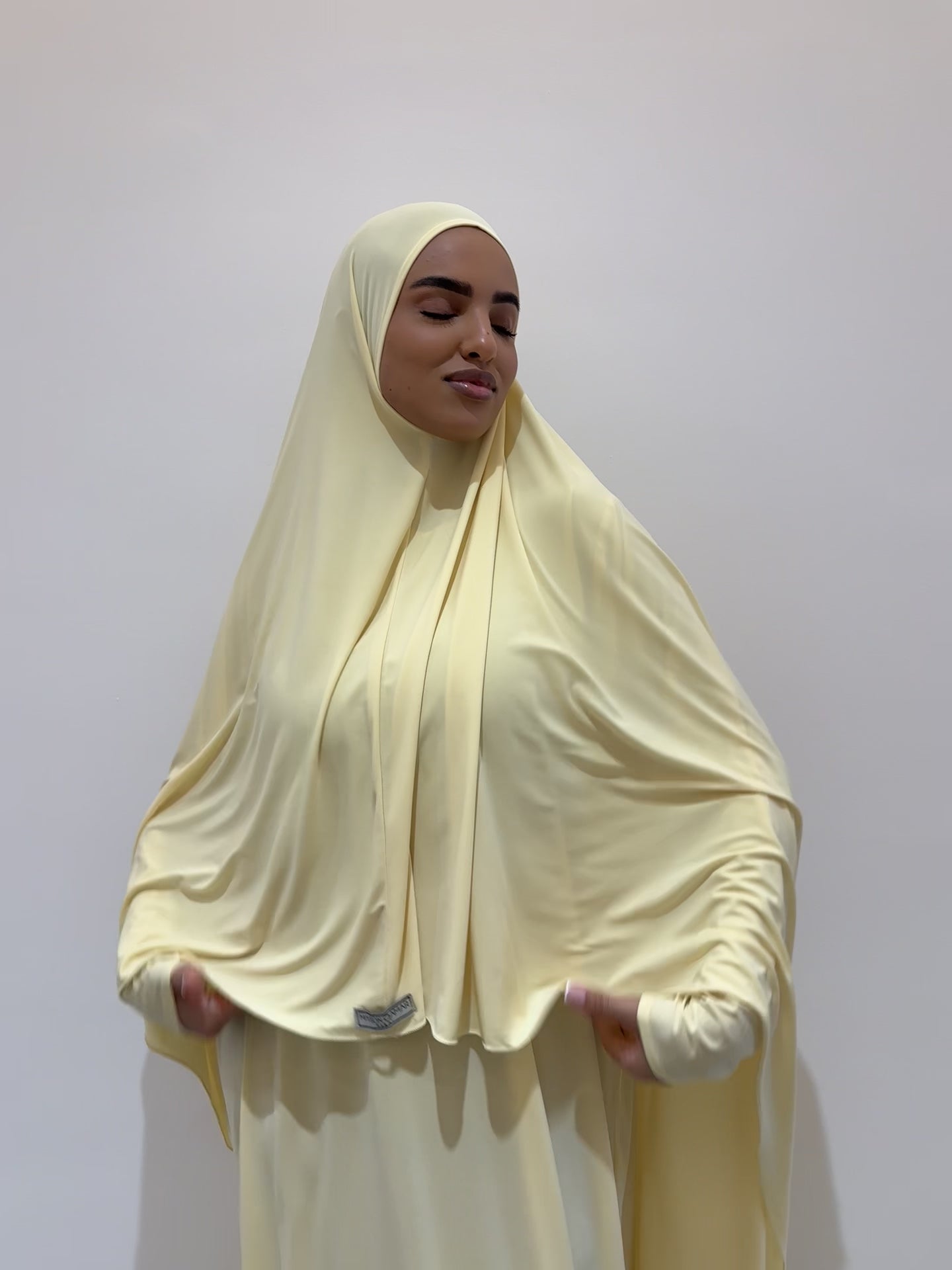 The Butter Yellow Khimaar Set features a gracefully draped khimaar paired with a matching underdress, creating a cohesive and sophisticated look. The subtle yellow hue exudes refined elegance, making it a versatile choice for various occasions.